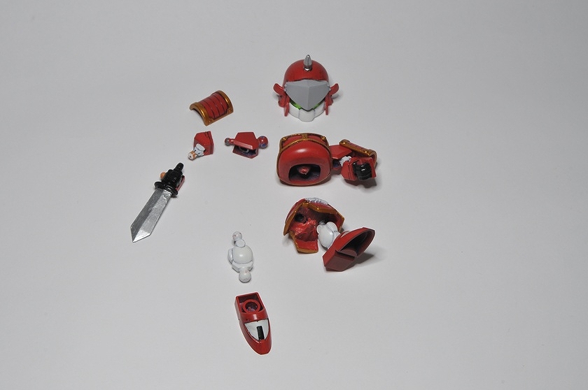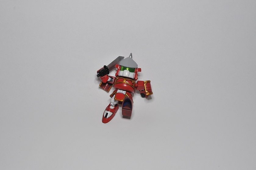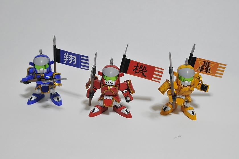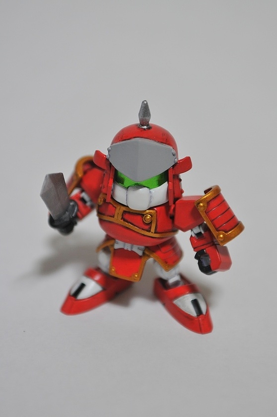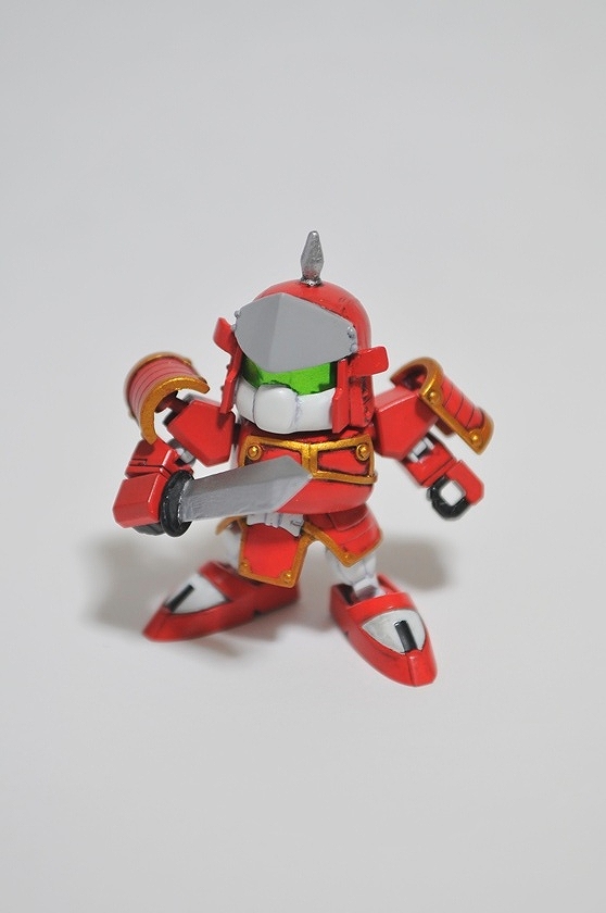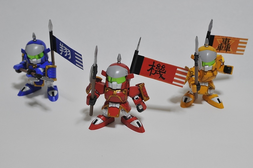 とにかくマイナーでwikiにすら記述が無い程。そのため資料が殆ど見つからず、結局足と背面は分からず終い。 拳にはMGのリックディアスの物を使用。 これのためだけに3600yenのMGを買った!俺バカ! さて拳以外丸々余ったMGリックディアスをどうしようか・・・ 足が無いのもかっこ悪いので、同じくSDガンダム世界の巨大武者「機動武者 大鋼」のキットから借りてきました。 背中はデザインが似ている「轟天頑駄無」を元に、俺が勝手にでっち上げてみた。 武器も形状が把握出来る資料が無かったので、デザインの似ている「轟天頑駄無」の物を拝借。 小さいから迫力が無い・・・ 俺所有のSDガンダム世界の巨人たち勢ぞろい。 左から「機動武神 天鎧王」 「覇道武者 魔殺駆」 「機動武者 轟天號」 「機動武者 大鋼」 「機動武者 烈火大鋼」。 今回自作した轟天號以外はただ組み立てて付属のシールを貼っただけ、いつか徹底改修してみたいが、いつになるやら・・・ 他に「超機動大将軍」 「スペリオルカイザー」等のキットが存在するが未入手。 おまけ、「機動武者 烈火大鋼」"Kidoumusya RekkaDaihagane"の箱裏に描いてあった謎のシルエット。詳細不明だが一応再現してみた。 現在fgにてSDガンダムコンペ開催中!SDモデラーなら参加しようぜ! 現在雑誌ケロケロエースにて連載中の「SDガンダム三国伝 戦神決闘編」に登場のピザ体型部隊兵を制作 「死んじまうぜえハッハァー」幼児を殺そうとしたり老人から粟を奪おうとする外道です。 3体ほど関節追加等作りこんだ 赤色兵はピザ体型、ヒゲ、ノーマルのコンパチ仕様 赤:商品化前に自作した物3体+ピザ1体+無改造11体 黄:自作版2体+関節追加改造1体+無改造7体 青:自作版1体+関節追加改造1体+無改造4体 合計30体制作 上から。 しかし沢山作っても飾っておく場所が無いと言うところまで考えが及ばなかったようだな!zeonistよ!!ハッハッハー! 全身に14箇所関節を追加、合計18箇所可動するから良く動く