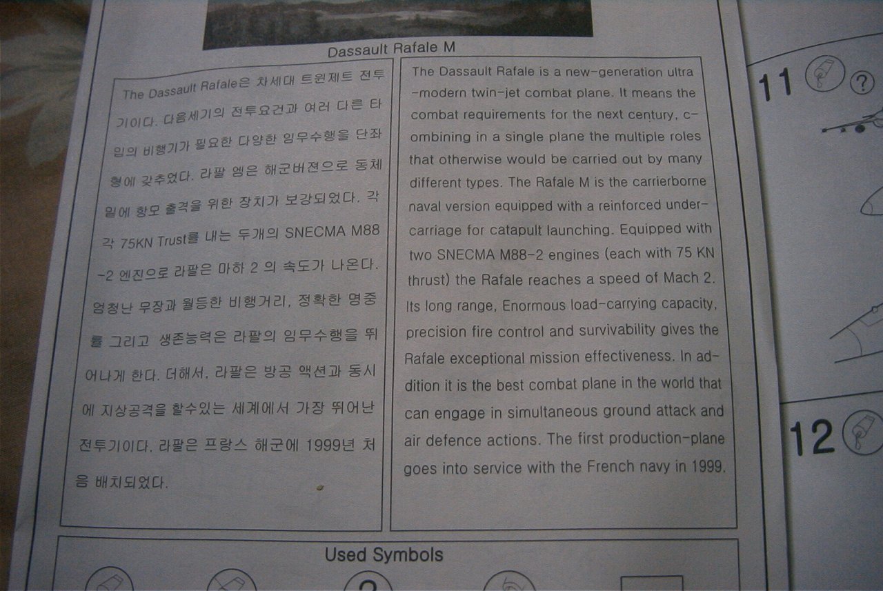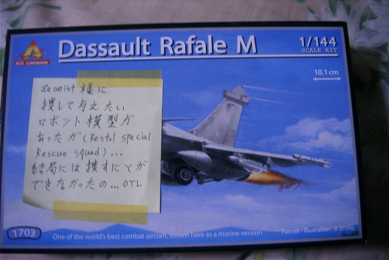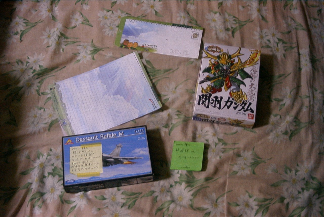 プラモ2点に手紙とメモ用紙に書かれたメッセージ 韓国語仕様の三国伝関羽ガンダム 箱もハングル 説明書とマンガもハングル キット自体は日本の物と同じ もう一つは飛行機だお⊂ニニニ( ^ω^)ニニ⊃ ブーン 説明書 日本語でおk 何故かキャノピーがランナーから外れてた 航空機模型は作ったことが無いんだが、航空機モデラーの友人からいくつかアドバイスを頂いた ・アフターバーナーの作り直しとコックピットのスケールが微妙かもしれないからその時は直した方が良い ・航空機初心者でも作りやすい機体、単色だからエアブラシ無しで缶スプレーでもいける とのこと。 あとこんなのも。 韓国軍で使われてるのかな?なかなか可愛いじゃないかw ともかくcia210cさんありがとう! その内apuroさんからお返しが届くと思います