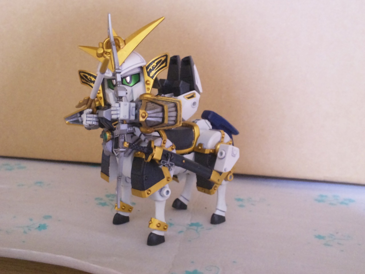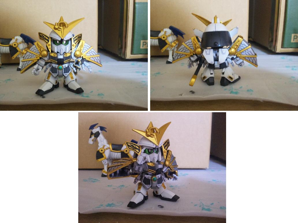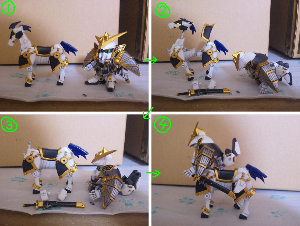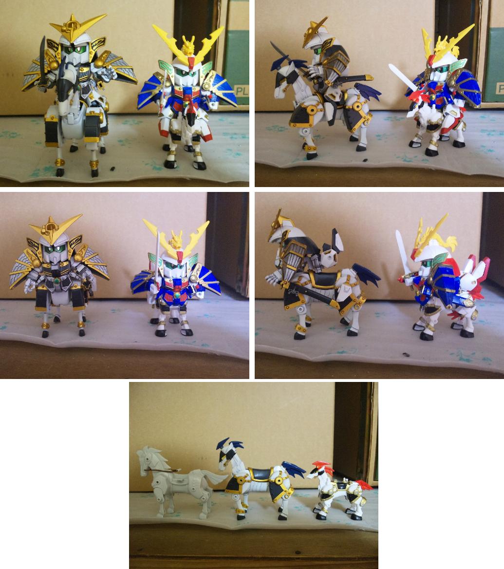 × [PR]上記の広告は3ヶ月以上新規記事投稿のないブログに表示されています。新しい記事を書く事で広告が消えます。 戦国武将「上杉謙信」をモチーフにしたSDガンダム 馬の大型化と謙信本体への徹底した関節追加と鎧の干渉を抑える改修のおかげで、流鏑馬ポーズも決まるようになった。 キット附属の馬はあまりにしょぼかったので最新シリーズ「三国伝」から戦馬を流用。 デザインも全然違うしギミックも搭載してないので大変だった。 今回の見せ場の一つは、後述する変形機構と腰関節可動の両立 こいつには馬と合体してケンタウロススペシャルになるギミックがついている。 馬を大型化しなければいけないが、これをオミットするのは余りに惜しい。 なので変形機構を考え実装させた。謙信本体よりも馬のほうがよっぽど手がかかっている。 ケンタウロススペシャル! キット附属の刀は大陸風の剣だったが、日本の武将と言う設定なので日本刀に変更。 人馬形態でも弓を撃つ なんと進化しているのはガンプラだけじゃなかった!俺も成長していた! 謙信の左に写るのは、謙信の元になったキット「疾風剣豪 精太」2004年ごろ発売 兜飾りと成型色以外は同じ仕様。 一番下は馬の比較。左から三国伝戦馬、謙信用馬、キット附属 PR